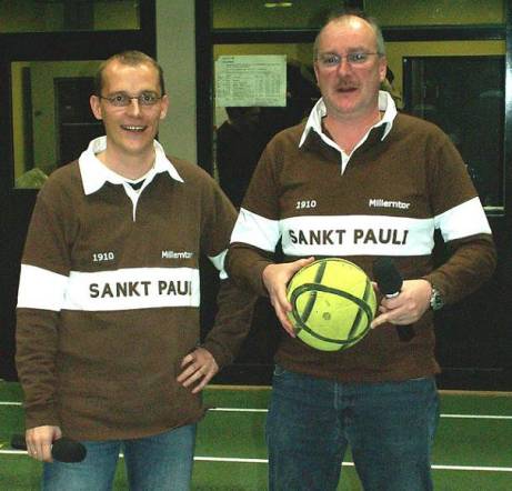 Als Hallensprecher waren wie eh und je das Duo „Detzer“ und „Nelling“ (Heiko Spiering (links im Bild, Ligaobmann SV Todesfelde) und Holger Böhm (rechts, Vorsitzender SV Todesfelde) aktiv und informierten die Zuschauer über die Torschützen und aktuellen Tabellenstände.