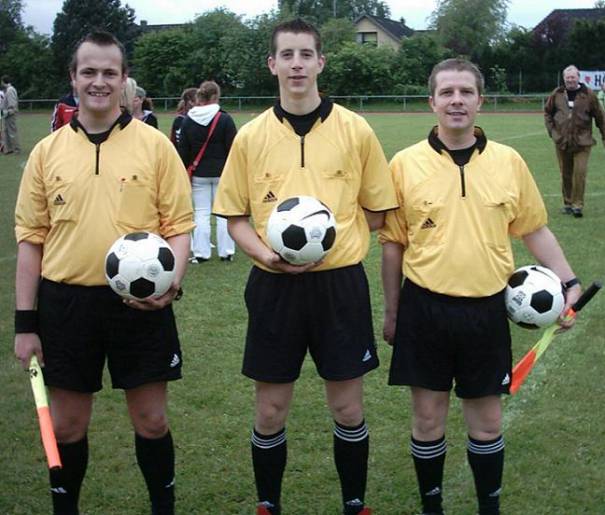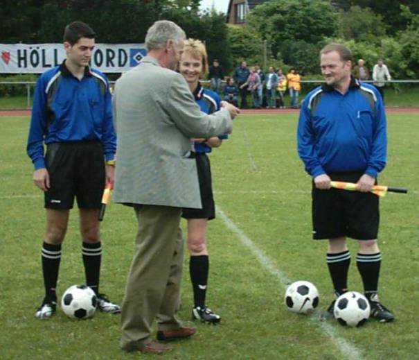 Hans-Jürgen Lühmann geehrt. SR Patrick Petersen-Lund (TuS Hartenholm, Mi.) steigt ebenso wie sein Assistent