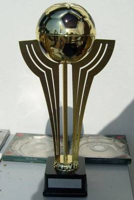 den neuen Kreispokal an Alexander Glandt, den Mannschaftsführer des siegreichen SV Henstedt-Rhen.