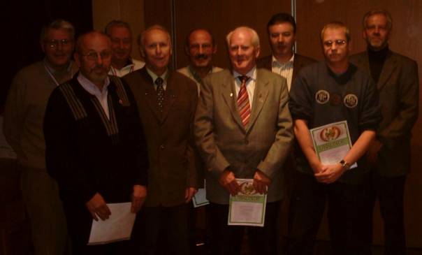 Alle geehrten SR: v.li.: Heinzi Westphal, Armin Kröska, Kurt Hagen, Horst Dwenger, Herbert Schlüter, Werner Schwarz, KFV-Vorsitzender H.-J. Schöps, Torsten Haß und SR-Obmann H.-J. Lühmann.